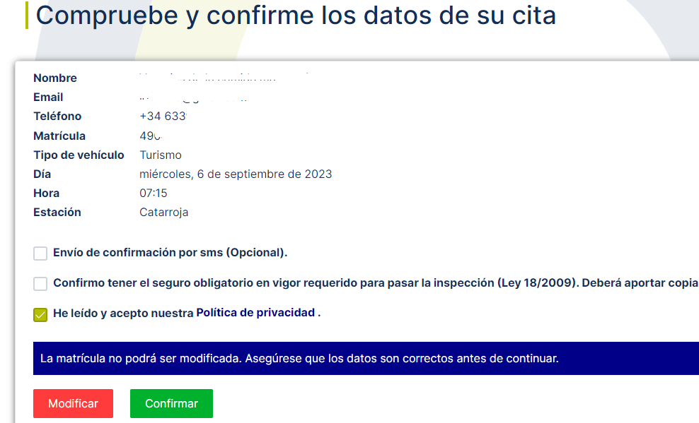 Por último y sexto paso, confirma que los datos sean correctos. Dale a confirmar cuando estés seguro y listo, cita previa confirmada.